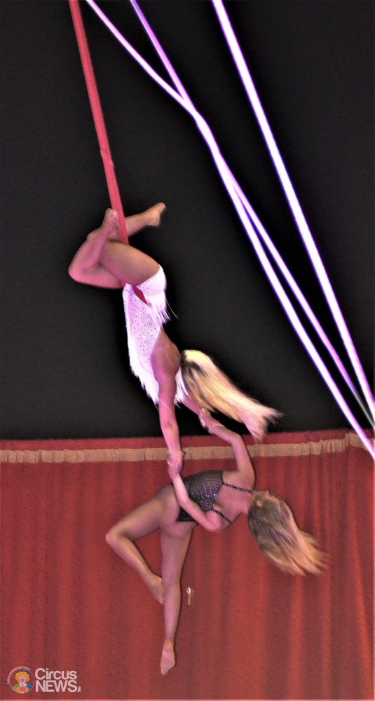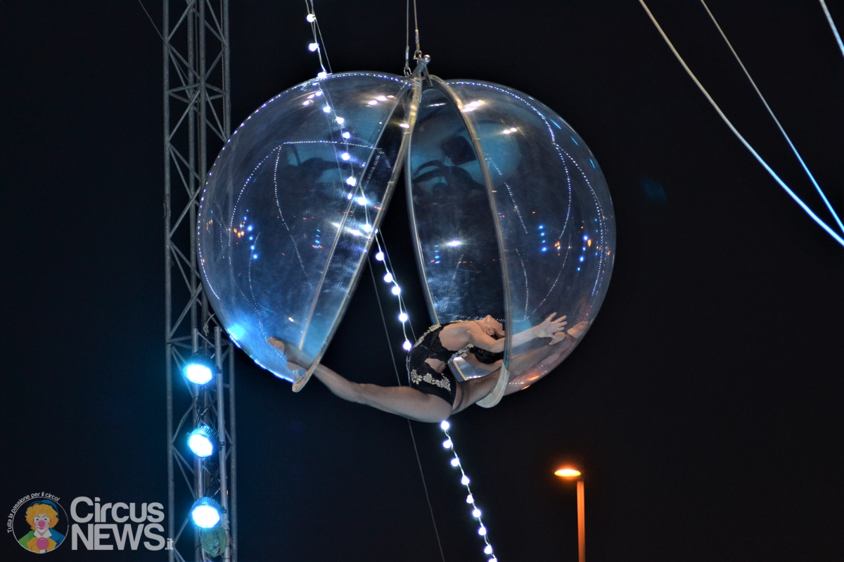 Poi il trapezio con Elisabeth Busnelli, le cui doti artistiche si fondono anche in raffinatezza ed eleganza. L’hula hoop nella pregevole interpretazione di Teresa Stojcic ha seguito la bellissima esibizione in doppia cinghia aerea di Stefany Stojcic e Taylor Curatola, quest’ultima molto abile anche nella pole dance. Ed ancora l’equilibrista-verticalista Elisabeth Busnelli. Indi Erik Niemen, poliedrico artista, premiato nel 2015 a Montecarlo ed in altri festival internazionali, bravissimo sul filo d’acciaio ed in un mortale salto da mozzafiato.