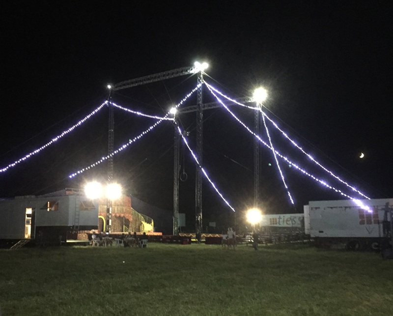 I fratelli d’Amico hanno ripensato il proprio spettacolo non sotto lo chapiteau, ma in una arena all’aperto, sotto le stelle, montando la struttura dei quattro pali portanti ai quali è fissato un supporto centrale che permette i numeri aerei. Dall’alto scendono fili di luci bianche che disegnano il profilo del tendone nella notte estiva. Il pubblico è sistemato nel parterre intorno alla pista e su una gradinata centrale di fronte all’ingresso artisti, una struttura a due piani rivestita di tendaggi rossi con una balconata superiore e due scalinate curve laterali che portano sulla pista rialzata utilizzata per alcuni numeri ad effetto teatrale.
