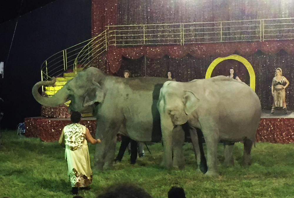 Quattro danzatrici in costume di ispirazione afro introducono Derek D’Amico e i suoi due elefanti indiani; mentre fino ad alcuni anni fa anche il complesso più piccolo aveva almeno un elefante, oggi trovarne due in un circo è una autentica rarità. Con buona pace degli animalisti più intransigenti, i pachidermi rappresentano un motivo di richiamo e di meraviglia soprattutto per i bambini, che fino a quel momento hanno potuto vederli solo nei libri o su internet. Le loro ottime condizioni ci convincono sempre di più della inutilità delle “crociate” condotte dagli animalisti contro i circhi, semmai meritevoli di lodi per la cura e le attenzioni verso i loro “familiari” a quattro zampe.