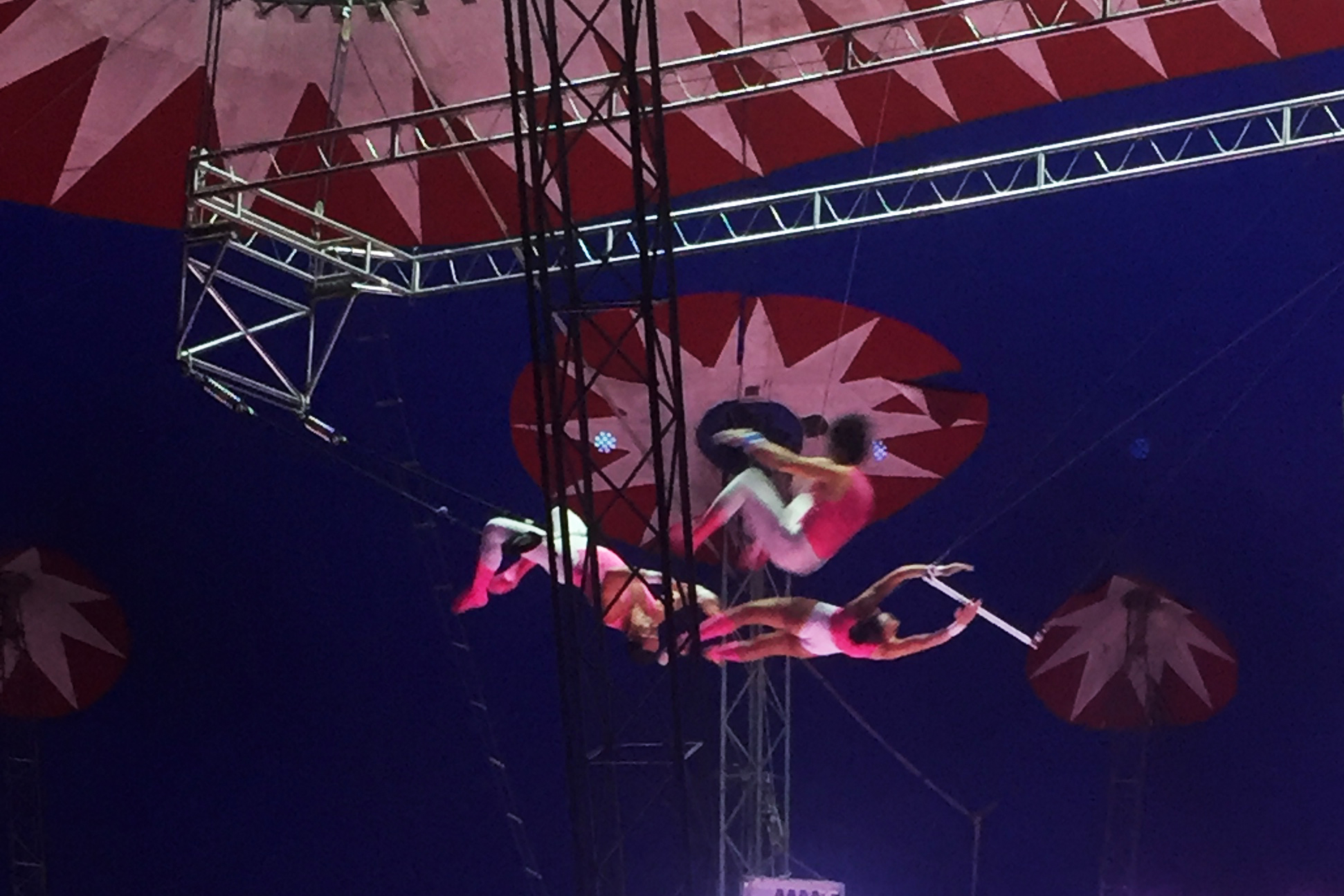 Ventidue anni e la classe di un grande: è Maverik Piazza, che con il suo numero di cinghie aeree conquista la parte alta del tendone, fino ad arrivare sotto la cupola, tenendo il pubblico col fiato sospeso e il naso all’insù. La performance è molto dinamica ed alterna salite in rotazione a figure in volo circolare, esercizi eseguiti a due braccia e poi ad un braccio solo. Dietro un numero di questo genere c’è senz’altro uno studio e una preparazione maniacali: gli stop in plancia perfetta a mezz’aria ne sono la conferma. Un mix perfetto di forza, equilibrio e agilità. Spettacolare la discesa finale a srotolo da grande altezza. Emozionante.