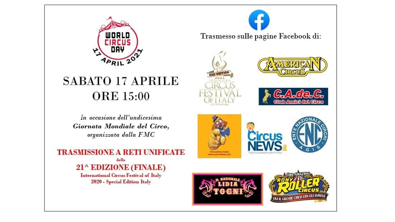 Il cartellone degli appuntamenti è ricchissimo ed abbraccia i diversi continenti; da Latina, sede storica dell’International Circus Festival of Italy, in accordo con l’Ente Nazionale Circhi, l’American Circus, il Circo Nazionale Lidia Togni, il Circo Rony Roller, circusfans.eu, circusnews.it, amicidelcirco.it, parte l’iniziativa di una trasmissione “a reti unificate”: saranno coinvolte le pagine web che vorranno aderire alla diffusione in “cross-posting” delle riprese realizzate durante la finale della più recente edizione del Festival, la numero 21, dello scorso Ottobre. La trasmissione è prevista per le ore 15 (ora italiana) di Sabato 17 Aprile. Le testate di settore interessate potranno dare cenno di adesione in tempo utile agli uffici di Produzione del Festival. Quanti vorranno assistere alla trasmissione potranno collegarsi via web ai principali canali di settore Sabato 17 Aprile alle ore 15.00. Il “cross-posting” consentirà a ciascuno di sentirsi “protagonista” dell’evento, facendolo proprio, tanto da diffonderlo sui propri canali favorendo la continuità delle relazioni con i propri followers e sostenitori.
