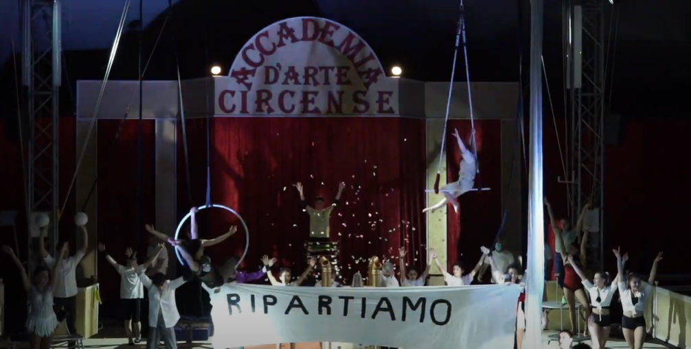 RIPARTIAMO. E’ la scritta che compare su un grande striscione srotolato dai ragazzi a fine saggio. Non è solo una scritta: è un proclama, quasi un urlo liberatorio che scoppia fragoroso dopo tanti mesi di chiusura forzata e di inattività. E inattività è una parola che non esiste all’Accademia d’Arte Circense di Verona. Qui si formano gli artisti del circo di domani: ragazzi che lavorano sodo, che si alzano la mattina presto per frequentare le scuole elementari, medie e superiori del circondario, che rientrano in sede e, dopo il pranzo e un po’ di compiti, indossano maglietta e scarpini e vanno a costruire il loro futuro con sacrificio, fatica e sudore, ma anche con tanta passione.