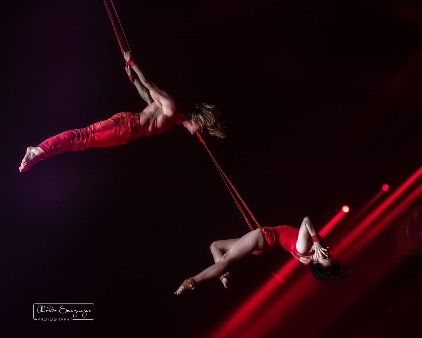 Deep Red, profondo rosso. E’ tutto rosso, dai costumi, alla pista, persino le cinghie sono rosse. Anton Markov e Ekaterina Rubtsova arrivano dalla Russia e con il loro strepitoso numero di cinghie aeree hanno incantato il pubblico. Una coreografia capolavoro, curata nei minimi dettagli (studiata da due dei più grandi coreografi del circo Nikulin) che completa un’esibizione di altissimo livello tecnico. Da antologia le evoluzioni di Ekaterina alle cinghie sostenute solo con i denti da Anton. Finale tra i petali di rosa, ovviamente rossi.